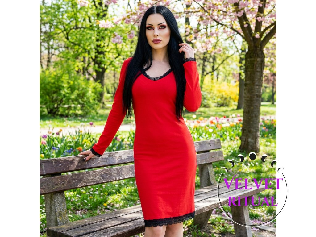 Model je ušitý z příjemného úpletu, který se přizpůsobí tělu a zároveň drží tvar. Kontrastní krajkový detail dodává šatům jemný dramatický akcent a podtrhuje jejich charakter.